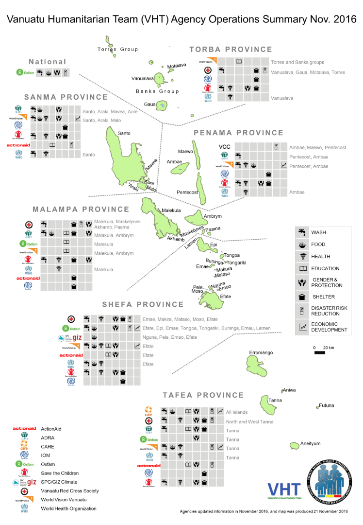 The Vanuatu Humanitarian Team (VHT) is a network of agencies committed to effective humanitarian coordination, disaster preparedness and humanitarian response. The VHT is convened by Oxfam; its members include the Vanuatu Red Cross, French Red Cross, Vanuatu Association of NGOs (VANGO), UNICEF, Oxfam, CARE International, Save the Children Australia (SCA), the Adventist Development and Relief Agency (ADRA), the World Health Organization (WHO), PeaceCorps, World Vision and Act for Peace, IOM and OCHA. |